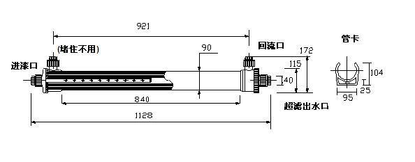 UF4040UPVC/ABS電泳漆超濾膜外形尺寸圖: 本產品為外壓式超濾膜,根據膜組件外壁的箭頭方向, 箭頭指向的端口是超濾透過液出液口,下部是電泳漆原液進液口,側面上面的口為電泳漆回流口,側面下面的口可以堵住不用;在電泳漆使用過程中可以使用水沖洗,超濾透過液沖洗,沖洗時從膜的回流口進入,原液進入口排出即可。當沖洗效果不是很好時,可以用有機酸和溶劑浸泡,循環沖洗清除膜中的油漆,從面恢復膜的通量。 |